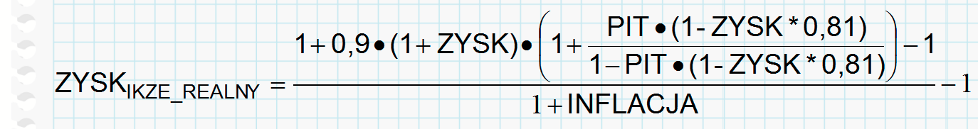 Na tym etapie martwić może pojawienie się we wzorze wartości KWOTA. Czyżby wynik inwestycji mógł zależeć od KWOTY inwestycji? Oczywiście nie – tutaj mamy współczynnik ZWROT/KWOTA – czyli jaką proporcję daje zwrot z podatku do kwoty wyjętej z kieszeni. A ta zależy od procentowej wysokości należnego zwrotu z PIT – który może wynosić 17%, 19% (dla działalności gospodarczej) czy też 32%. We wzorze oznaczam ten procent zwrotu to jako PIT.