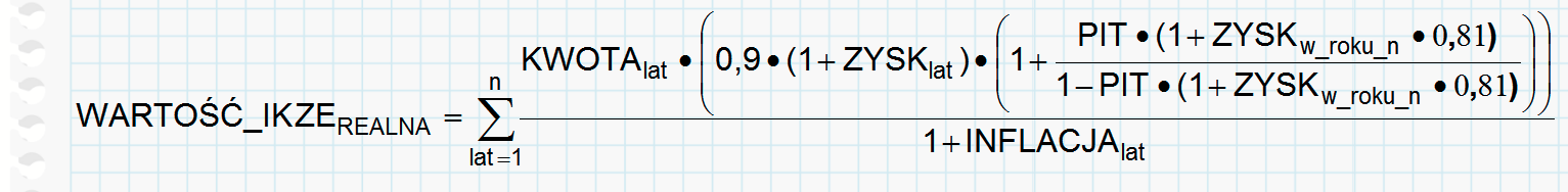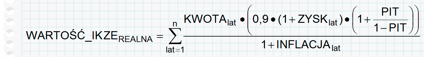 Każda wpłata na IKE / IKZE pracuje przez określoną liczbę lat na zyski. I zgodnie z powyższymi wzorami wypracowuje określony zysk. Aby sprawdzić jaka kwota będzie na koniec inwestycji musimy uwzględnić zarówno wpłatę jak i zysk. I całość końcowej wartości inwestycji skorygować o łączną inflację w tym czasie. Robimy to dzieląc końcową wartość inwestycji przez (1+łączna_inflacja) i odejmując 1 na końcu (aby mieć realny zysk). Tę jedynkę najpierw dodajemy (jako kapitał+ zysk) a na końcu odejmujemy aby mieć realny zysk z nie realny wzrost wartości razem z wpłatą.